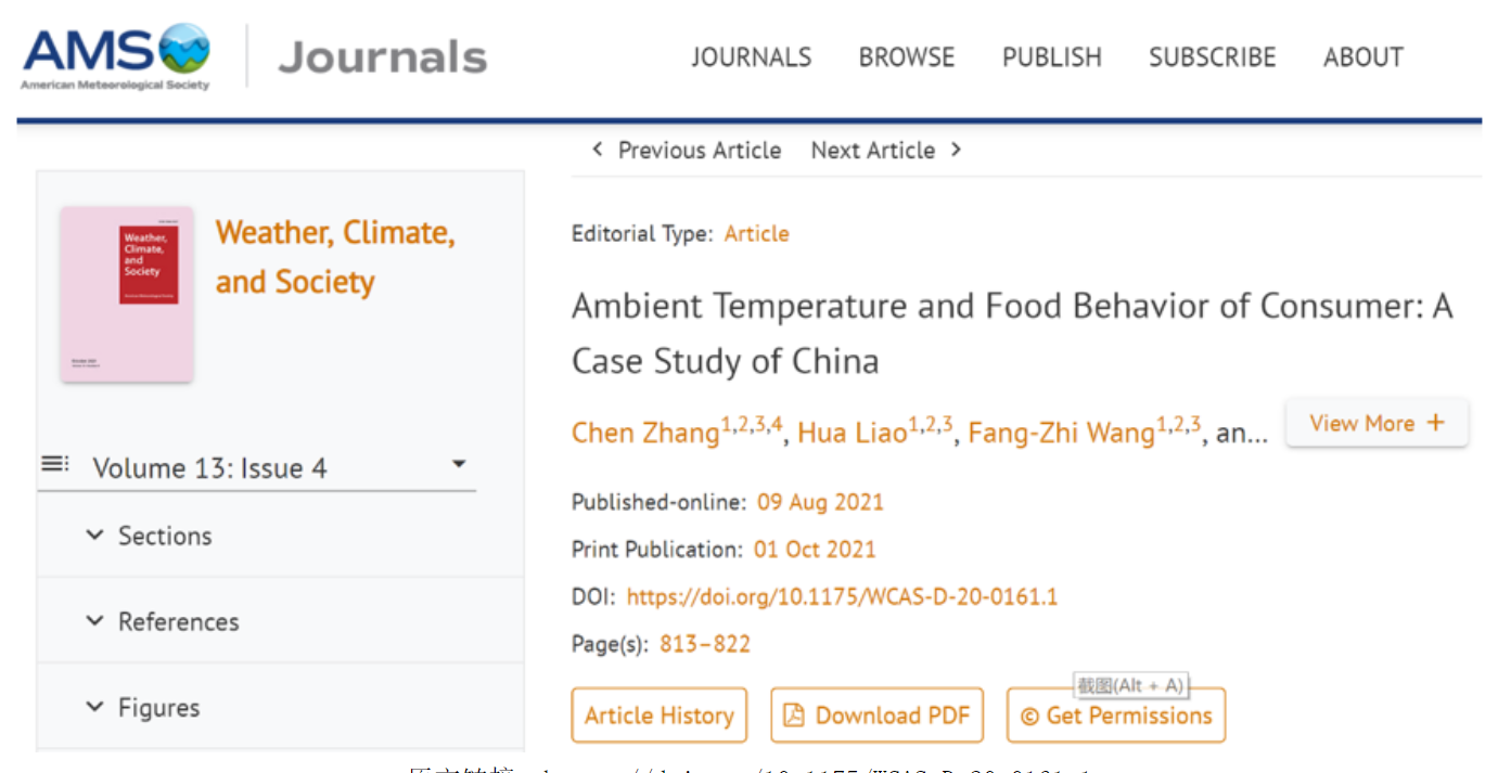 Recently, the thesis of Ambient Temperature and Food Behavior of Consumer: A Case Study of China, which was jointly published by Zhang Chen, a doctoral student of the Center and Professor Liao Hua, was published in Weather, Climate and Society (wcas) sponsored by the American Meteorological Society.
