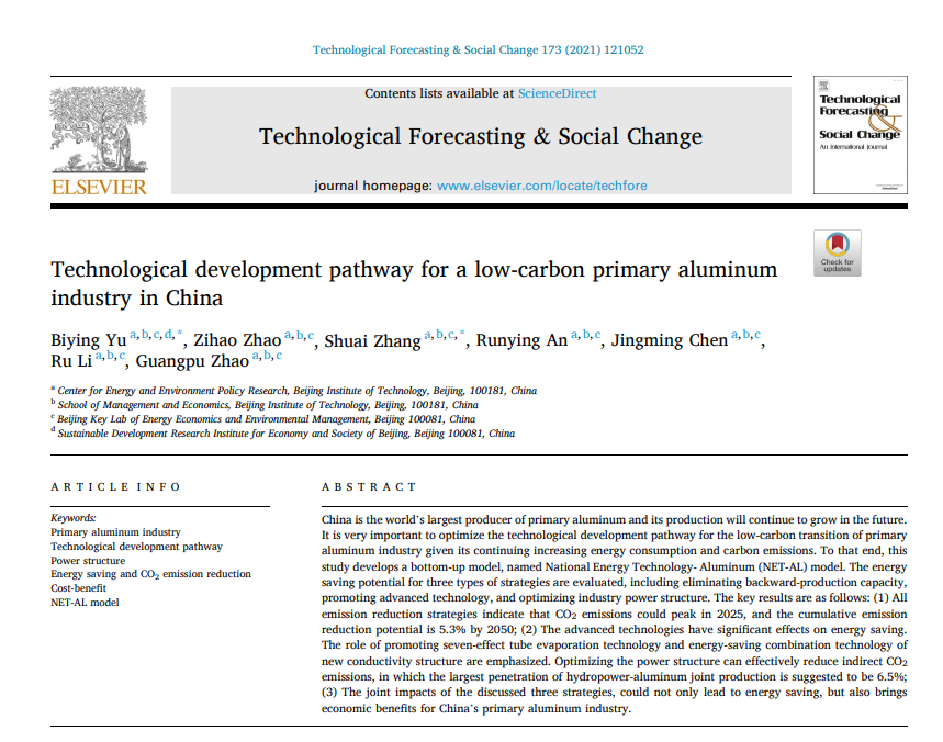 Recently, the paper "Technical Development Pathway for a Low Carbon Primary Aluminum Industry in China" by Professor Yu Biying and students Zhang Shuai and Zhao Zihao of the center was published in the international journal "technical forecasting & social change".