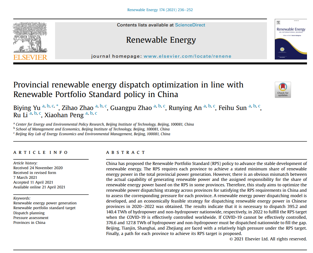 Recently, the paper "Provincial renewable energy dispatch optimization in line with Renewable Portfolio Standard policy in China" by Professor Biying Yu and doctoral student Zhao Zihao of the CEEP-BIT was published in the international journal "Renewable Energy".